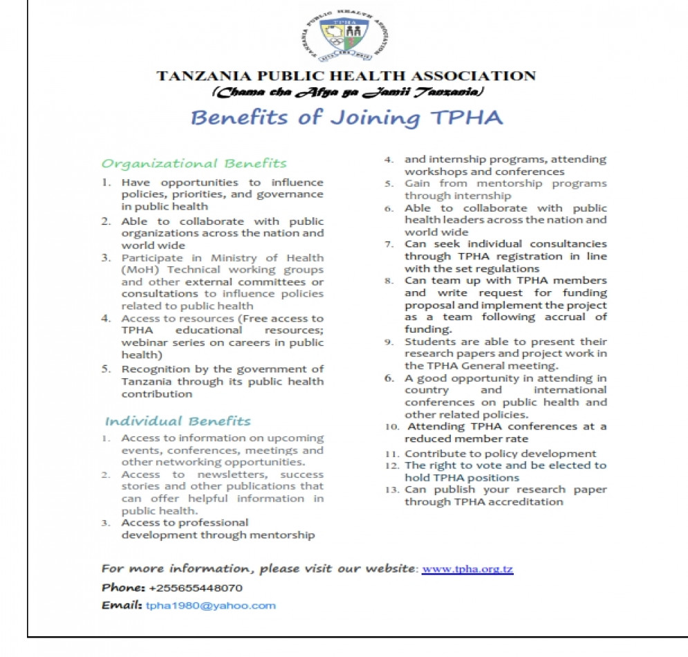 Tanzania Public health Association (TPHA) was established in 1980 with the aim promoting health and preventing disease in Tanzania, through advocacy for sound public health policies and practices and for healthy lifestyles. The association draws multidisciplinary health practitioners and many others interested in public health and solutions of health related problems. Membership is also open to non-Tanzanians residing within and outside the country. The Association’s membership is broad-based and multi-disciplinary. It includes medical and public health personnel, pharmacists, dentists, nurses, health officers, nutritionists, medical sociologists, behavioural scientists, economists, educationists, engineers, lawyers, veterinary practitioners and many others who are interested in public health and in the solution of health related problems. Currently the Association has over 2,666 members, the majority from within Tanzania. TPHA was established in 1980, registered on 27th December 1980 (Registration Number 6210) and received a Certificate of Compliance to the Non-Governmental Organization Act of 2002 No. 0751 in May, 2008. Currently TPHA is operating in Tanzania Mainland. However, it has members in Zanzibar as well as in other countries. So far, TPHA has 13 Regional Chapters in Arusha/Manyara, Dar-es-Salaam, Dodoma, Iringa, Kilimanjaro, Mara, Mbeya, Morogoro, Mwanza, Pwani, Shinyanga and Tanga. The Chapters address public health issues at regional and district levels, and are much closer to the communities.
